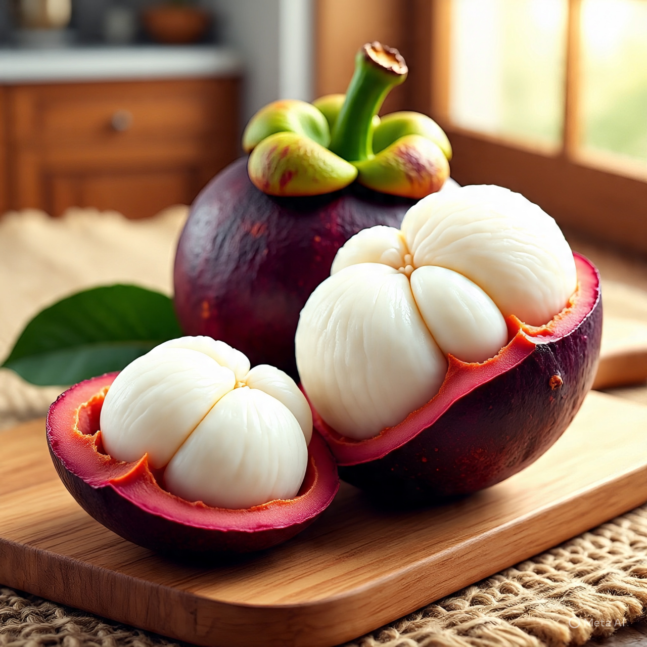 It is a tropical,, sweet-tart fruit known as the "queen of fruits," featuring a thick, deep purple rind (pericarp) and juicy, white, segmented flesh. Native to Southeast Asia, it is rich in antioxidants, specifically xanthones, and is often eaten fresh, juiced, or used in traditional medicine.